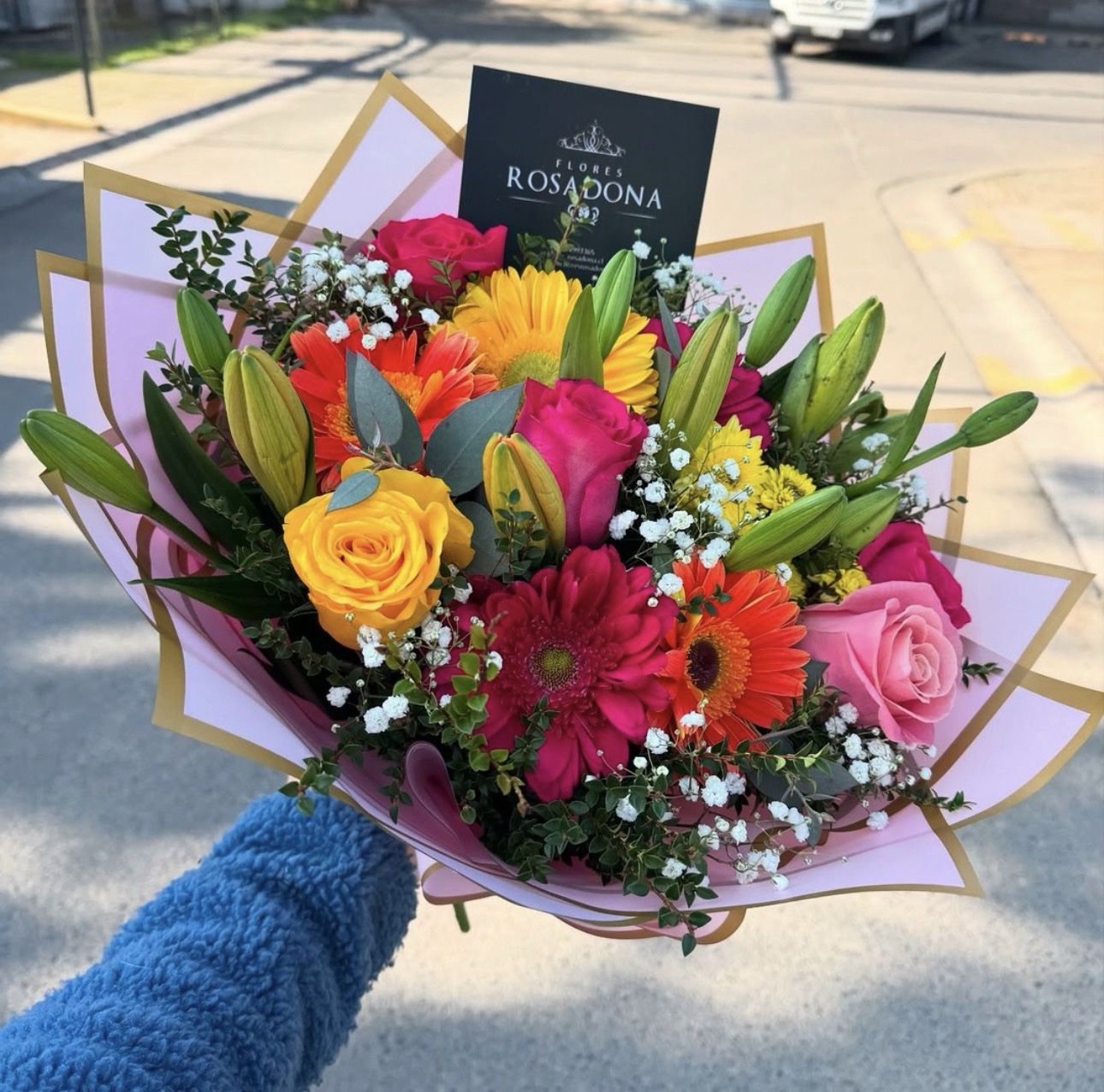 Lindo ramo en diferentes tonos, con un mix de flores como Gerberas, rosas, Lilyum y más