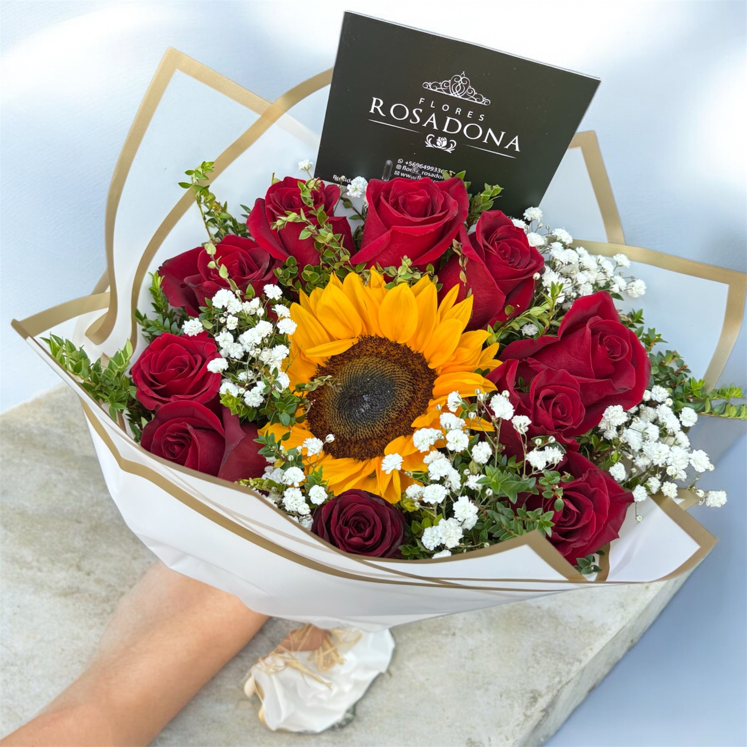 Ramo de 10 rosas rojas con 1 girasol en el centro