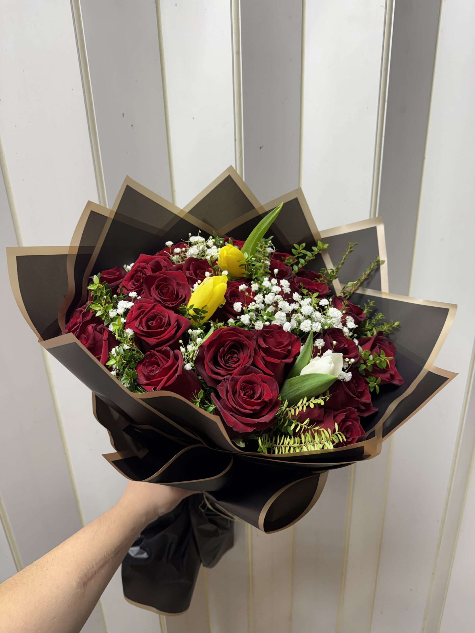 Elegante ramo de 24 rosas, acompañadas de tulipanes, Gypsophilia y eucaliptos. Con papel negro