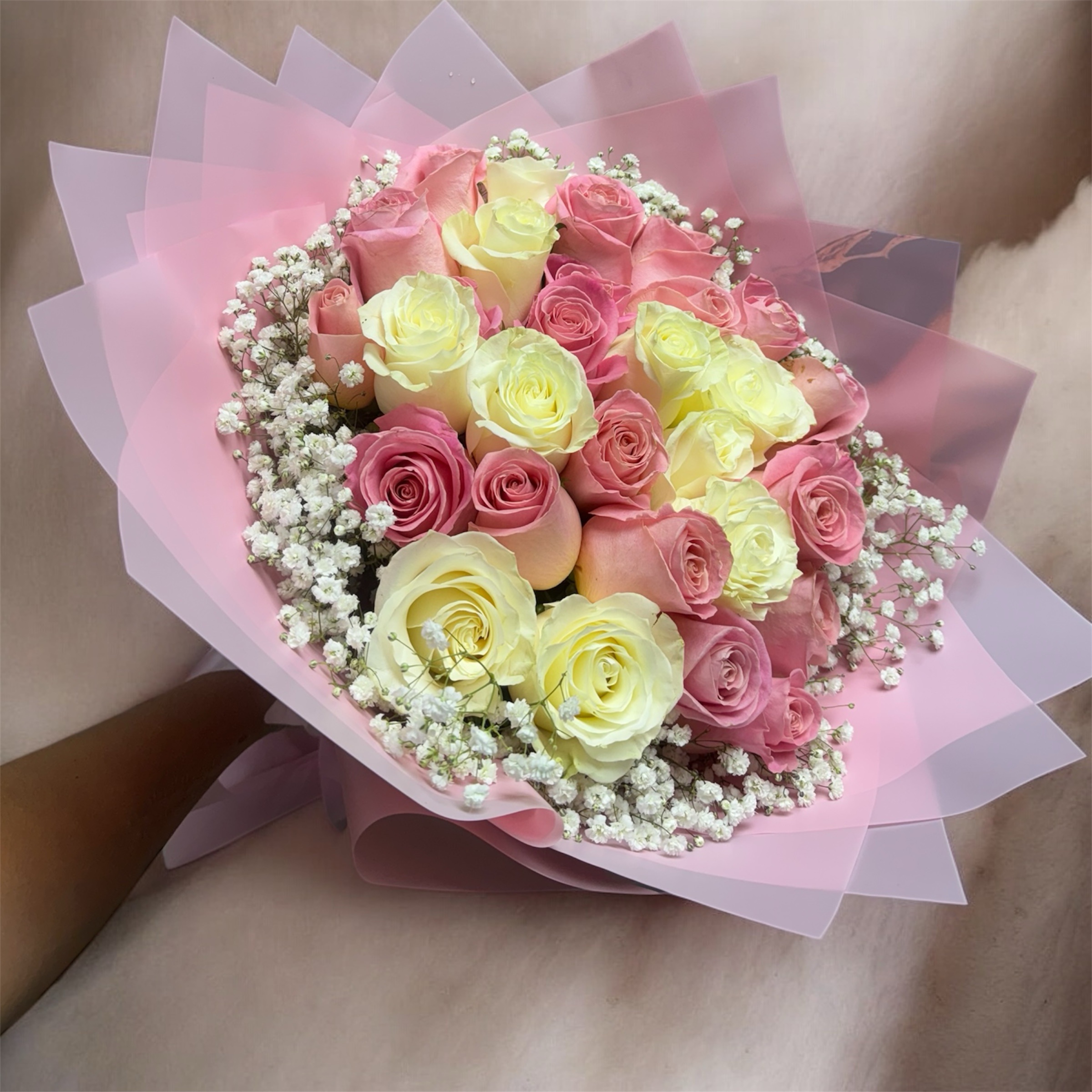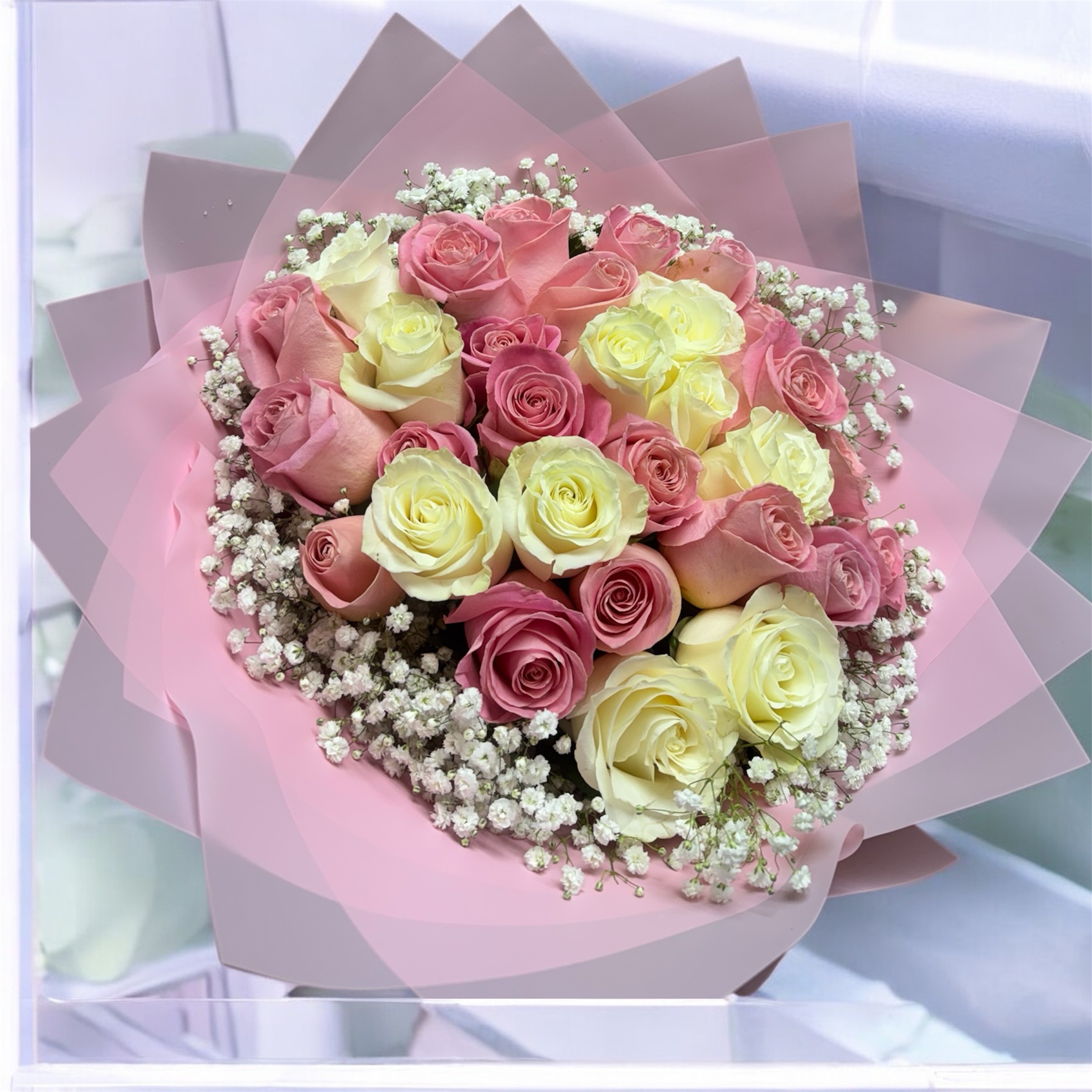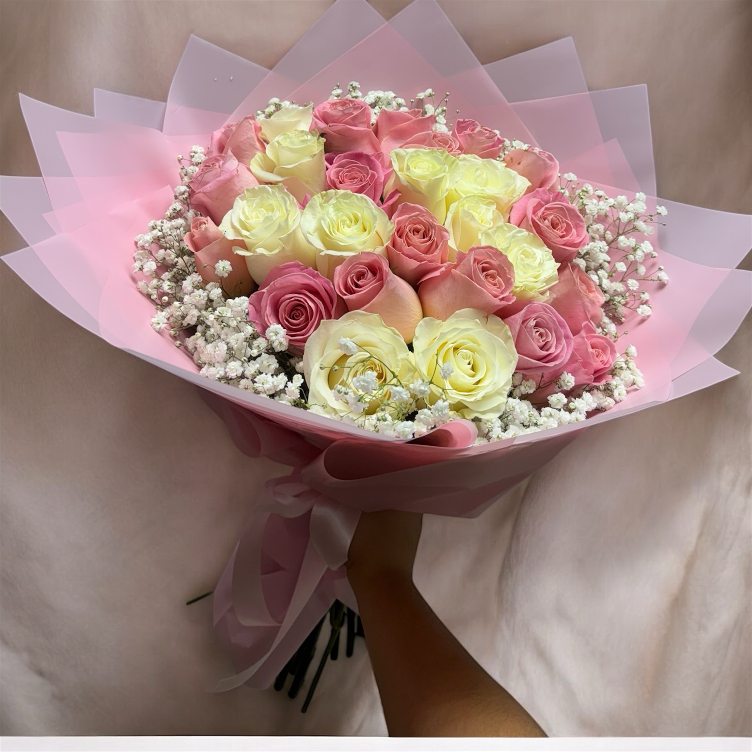 Una combinación sofisticada que equilibra la ternura de los tonos pastel con la vitalidad de las rosas frescas, diseñado meticulosamente para transmitir afecto, gratitud o amor puro.