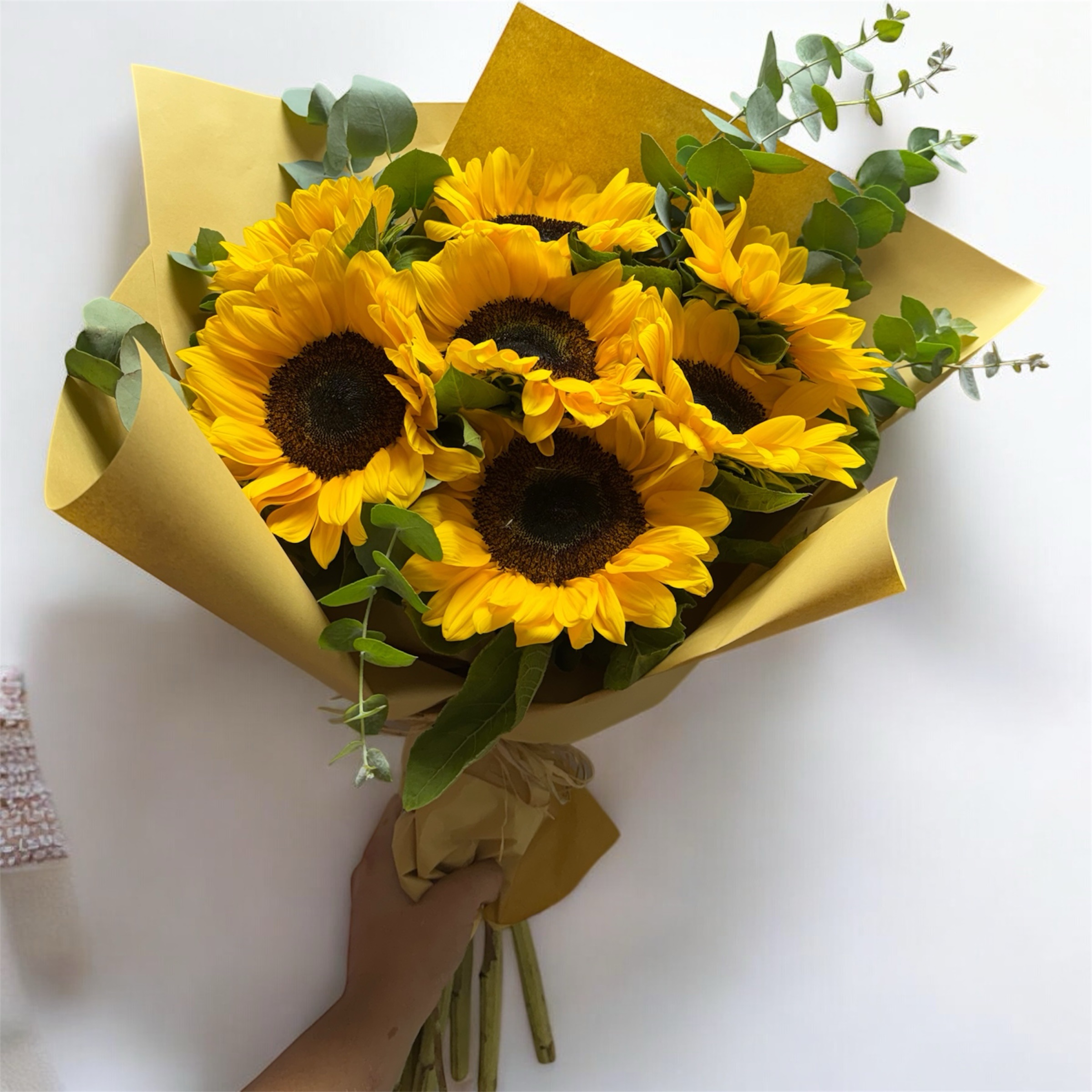 Elegante ramo de 7 Girasoles con toques de eucaliptos, envuelto en Kraft 🌻