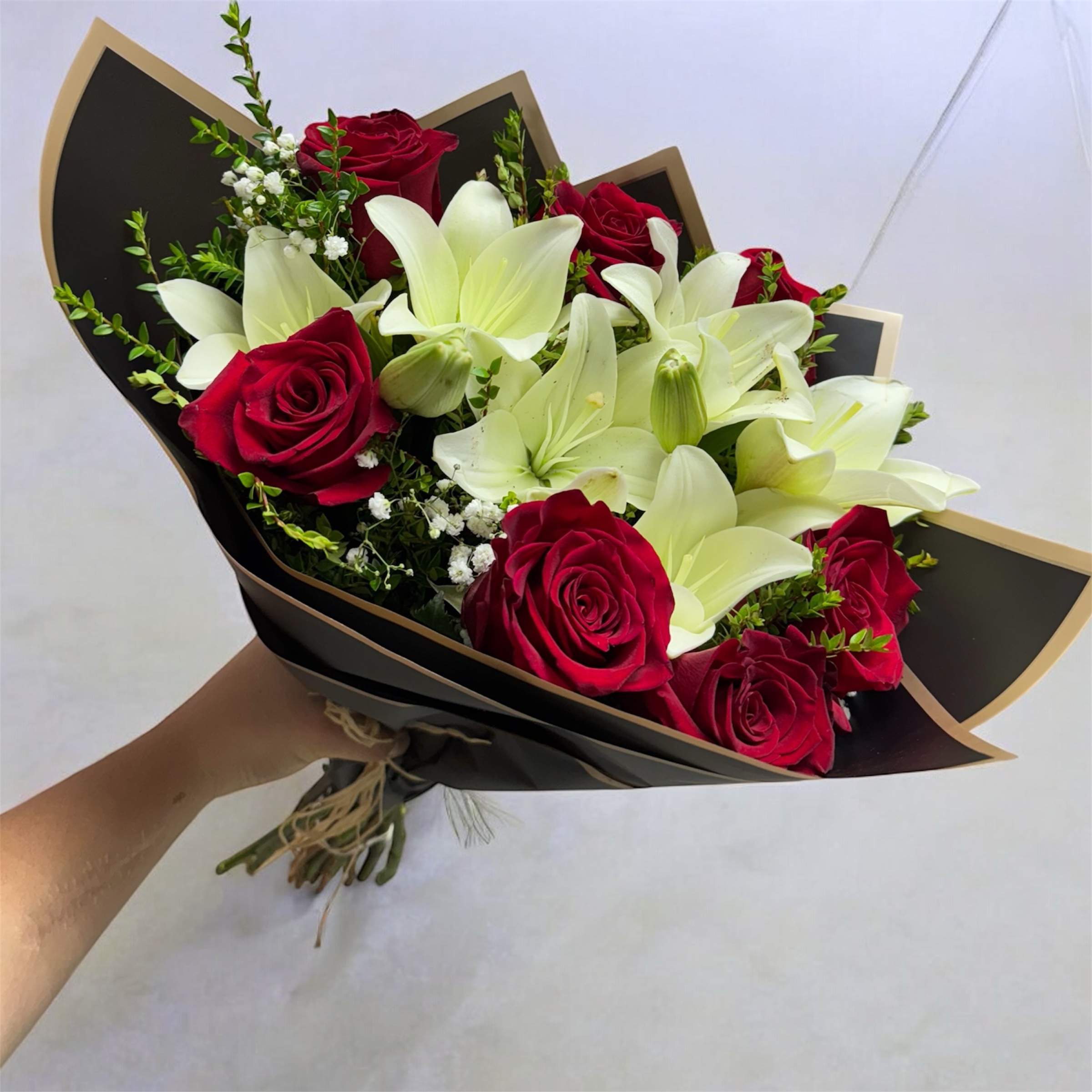 Ramo de 7 rosas rojas y 3 Lilyum blancos