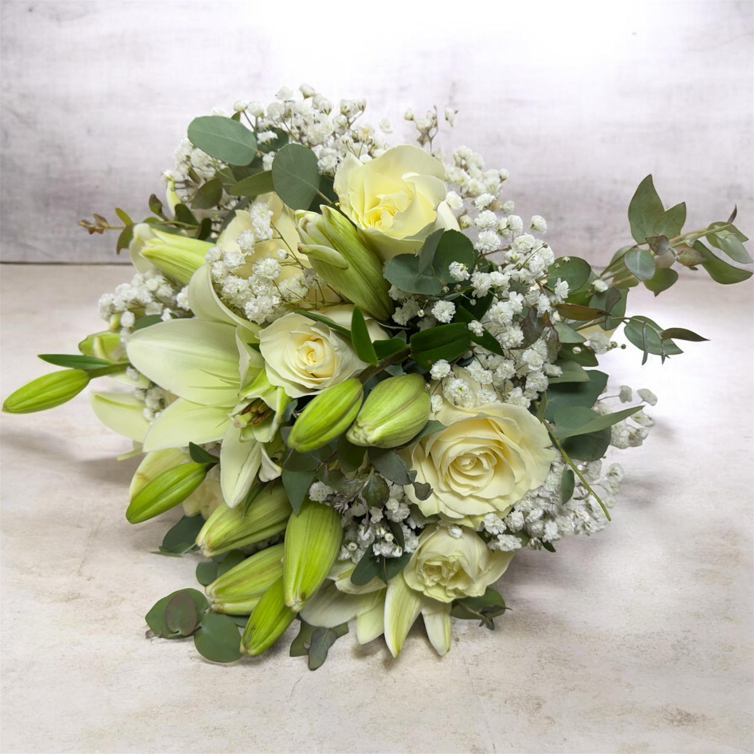 Ramo de novia con rosas blancas y Lilium blancos, decorado con eucaliptos y Gypsophilia.