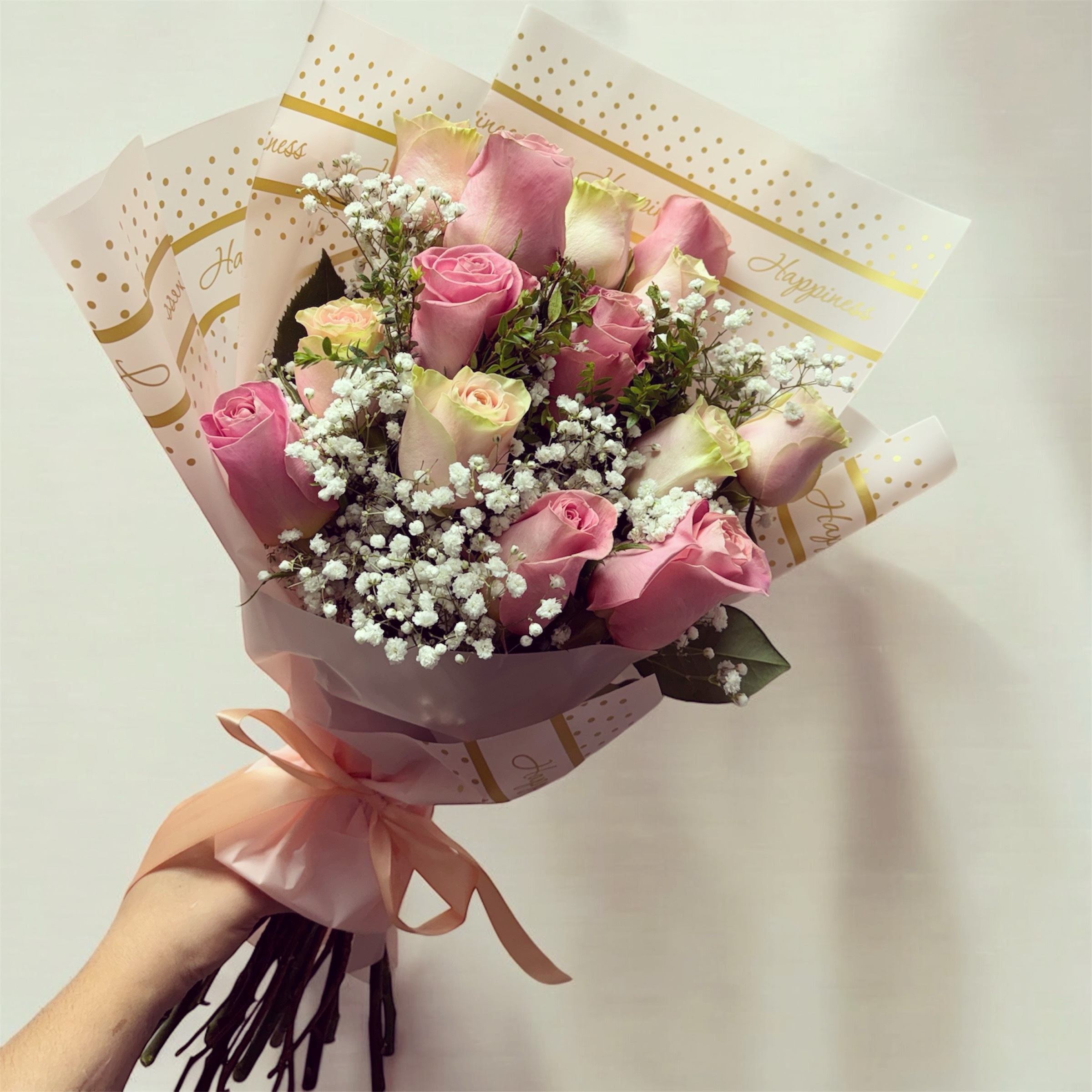 Hermoso ramo mixto de rosas rosadas en diferentes tonos. Acompañado con Gypsophilia